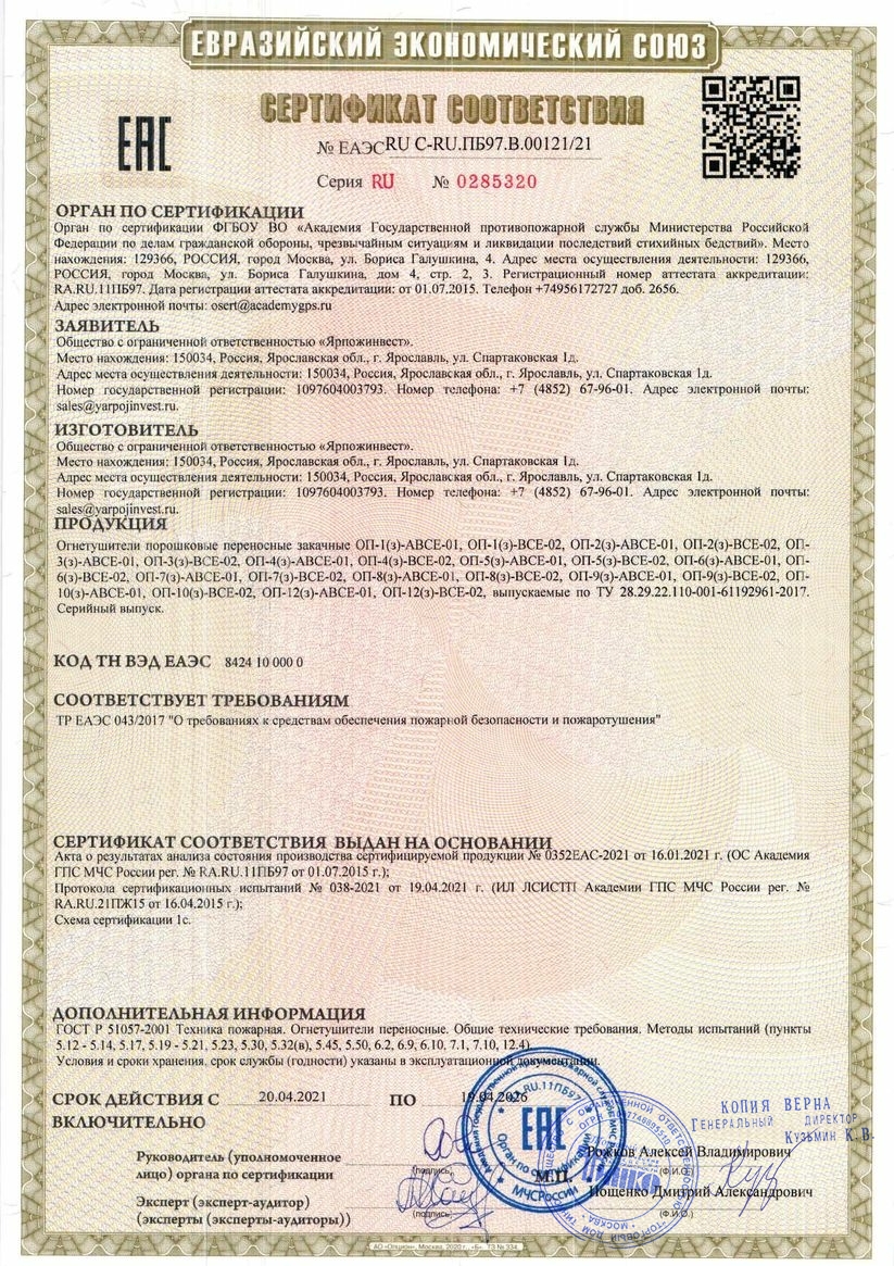 — Огнетушитель заряженный с опломбированным ЗПУ — 1 шт;